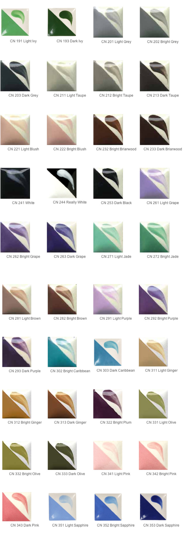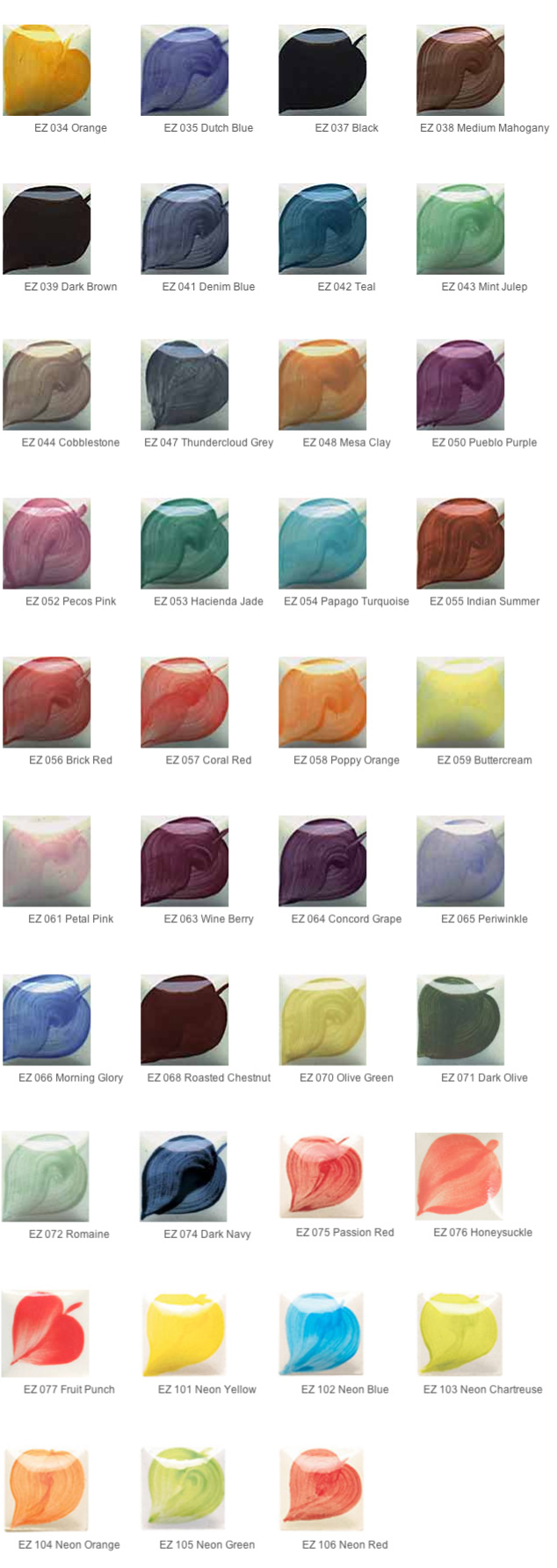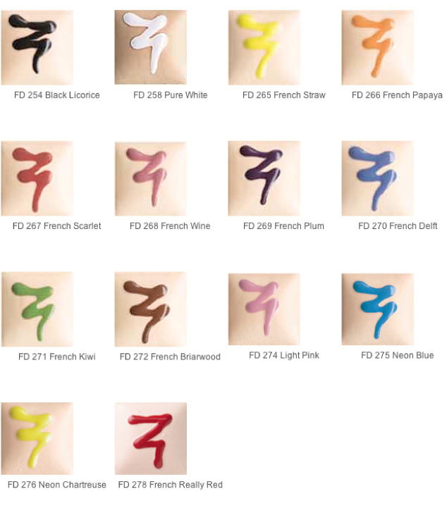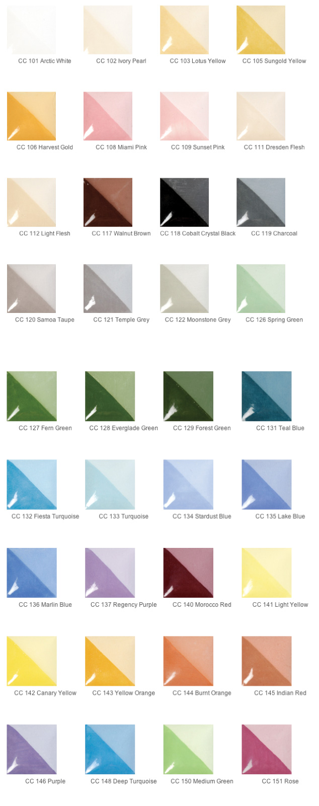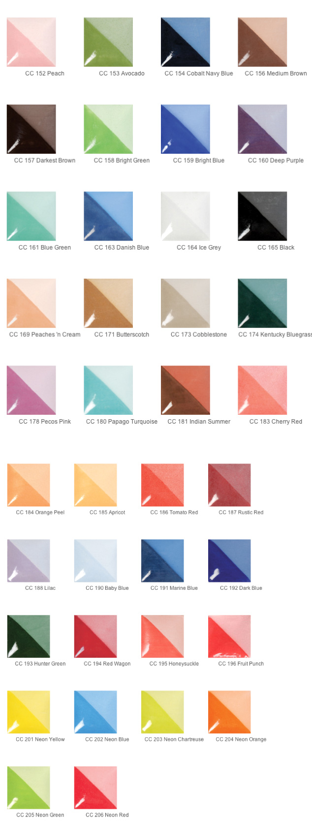 Sus intensos pigmentos permiten la mayor definición y decoración de sus piezas. Los colores están disponibles en botellas de 1 onza y también en pintas.